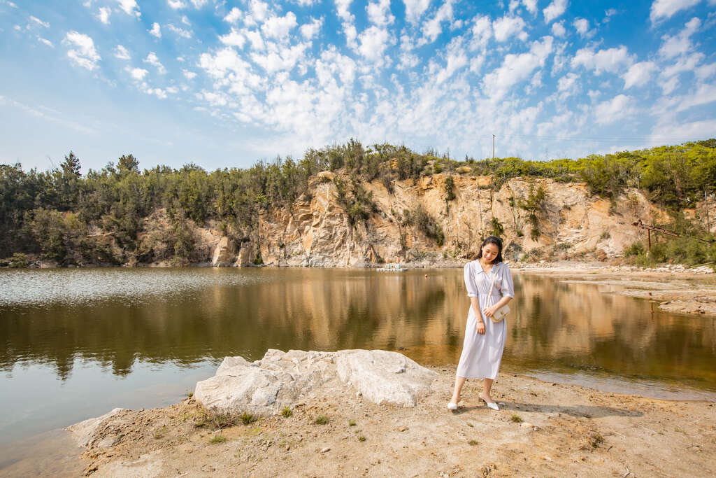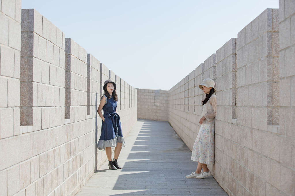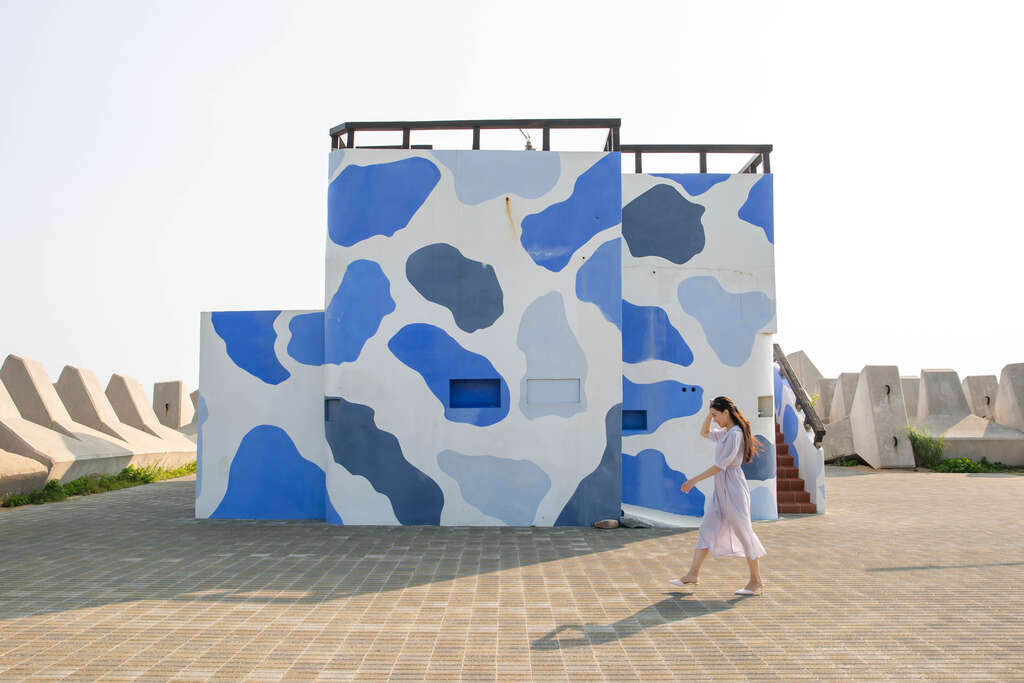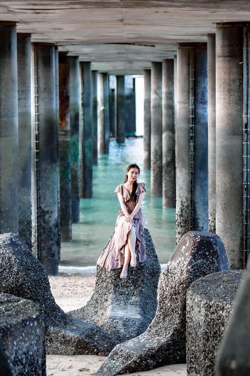 拍攝小技巧:走進消波塊內,潔白消波塊整齊排列於人像兩側,攀爬時務必注意安全