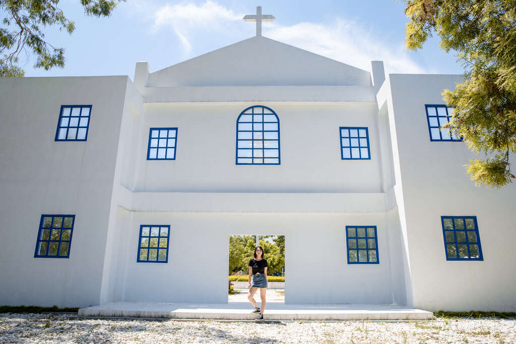 拍攝小技巧:站在潔白的教堂造景牆面前,擺出優雅的姿勢吧!