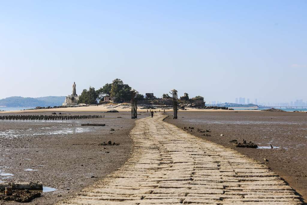 建功嶼潮退時,除了可以看見潮間帶豐富的生物外,還能沿著石板道登上建功嶼,因此被稱作金門版的摩西分海。