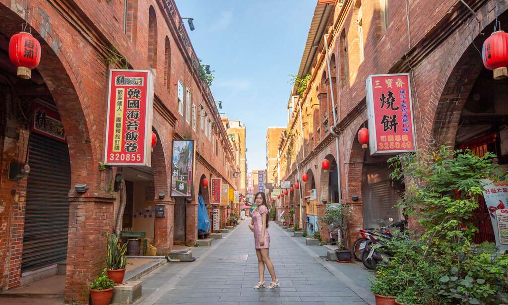 拍攝小技巧:站立在模範街中間,與後方對稱整齊的磚紅建築及國旗一同合影