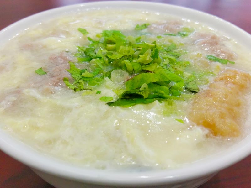 金門道地的早餐之一,與高湯煮成肉糜狀的廣東粥裡,有著滿滿的配料,豬肝、豬肉片、豬肉丸、魚丸……等,美味且十足飽滿。