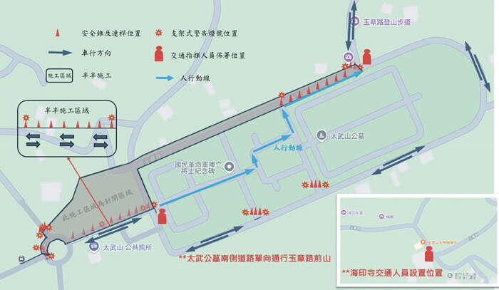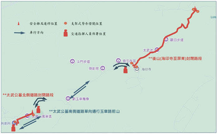 目前太武公墓北側道路已封閉,遊客須由南側道路進入玉章路。封閉期間,金管處將玉章路前山路段實施單線雙向通行,並派遣交通管制人員於太武公墓前方、玉章路牌坊下及海印寺停車場旁進行調度,協助引導車輛與徒步遊客安全通行。