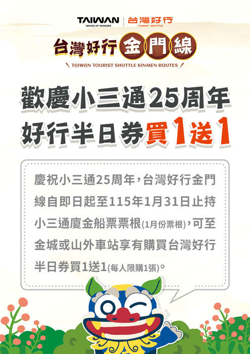 為歡慶金門與廈門「小三通」通行屆滿25周年,金門縣公共車船管理處特別推出旅遊回饋活動,針對深受旅客喜愛的「台灣好行金門線」,推出半日券限時「買一送一」優惠方案,邀請持小三通船票來金門的旅客,以更超值、便利的方式深入探索金門豐富多元的觀光魅力,體驗島嶼獨有的人文風采。