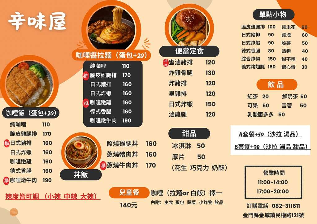 位於學區附近的「辛味屋」,是一間主打咖哩飯、拉麵、丼飯與便當的平價小餐館,由熱愛料理的老闆親手經營,秉持「吃得飽又吃得好」的理念。店內提供內用、外帶、便當外送與客製化服務。人氣餐點包括咖哩燉牛肉、咖哩拉麵搭配酥炸雞腿排,以及滷腿排便當和牛肉丼,每道料理份量十足,搭配自製辣椒醬更添風味,傳遞濃濃家常溫度與用心。