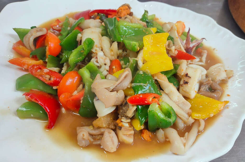 炒三鮮|簡單卻經典的一道熱炒,魷魚、花枝與鮮甜彩椒翻炒出家常又鮮明的香氣,口感豐富、色彩繽紛,是配飯也能單吃的百搭菜色。