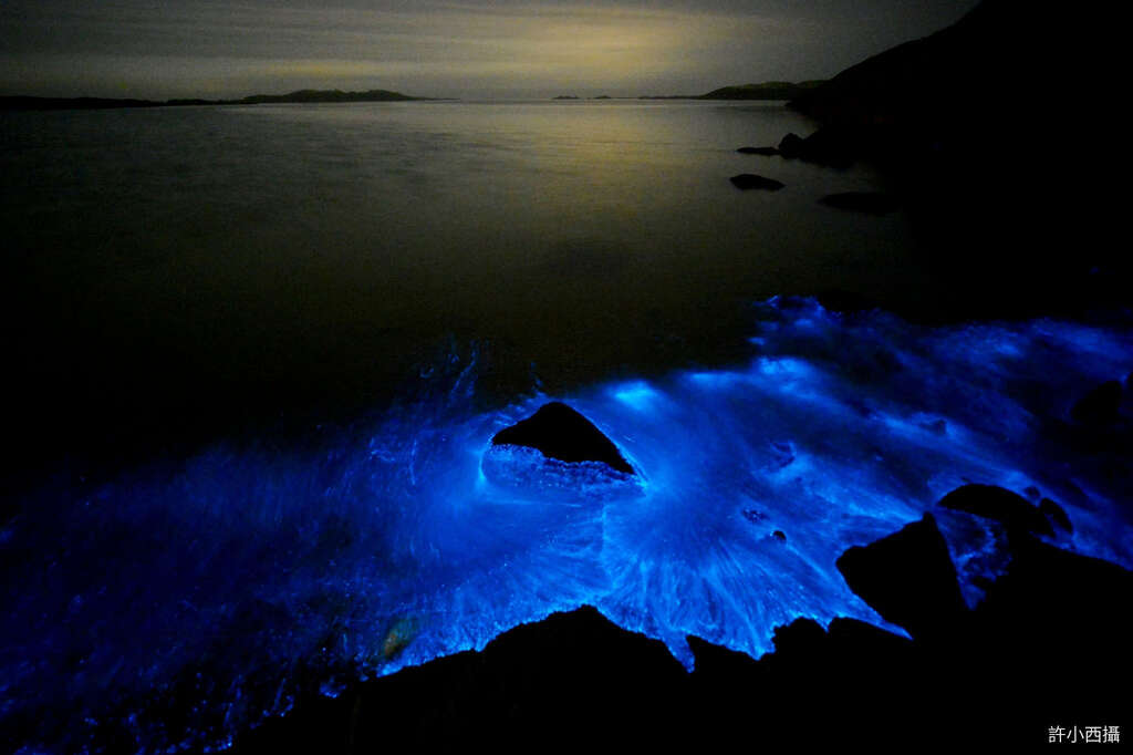 This is when the wind generally blows from the south in Kinmen, facilitating a deep ocean current and rise in seawater temperature. The warmer water is what dinoflagellates need to reproduce. The strong current stirs up the oxygen in the sea, triggering the dinoflagellates to emit light.