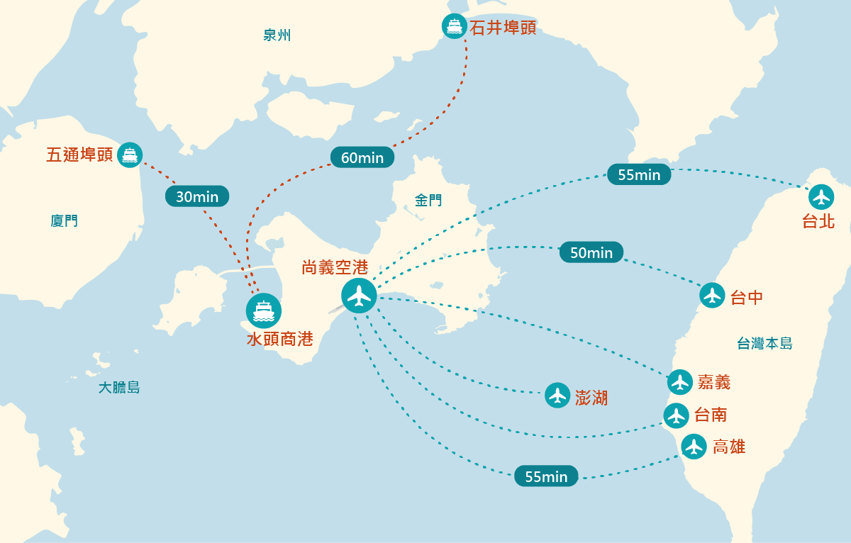 現在、金門に行くには、台湾本島から出発する必要があります。台湾に到着した後、台北松山空港で金門尚義空港行きへ乗り換える方法が、便数も最も多く、一番速い行き方となります。日本国籍の旅行者は、ビザなしで台湾に入ることができます。さらに情報が必要な場合は、台湾外交部領事事務局へお問い合わせください。滞在期間は、パスポートとビザの情報内容により異なります。その他、台中空港、嘉義空港、台南空港、高雄空港にも金門行きの便があります。詳しくは金門空港をご参照ください