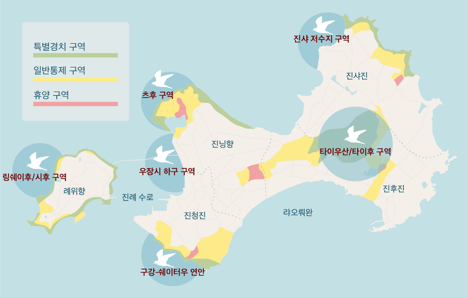 조류감상 주요포인트 : 톈둔구, 양산구, 푸볜구, 진샤저수지구, 칭위관아오구등.