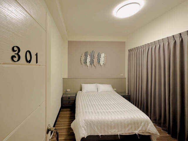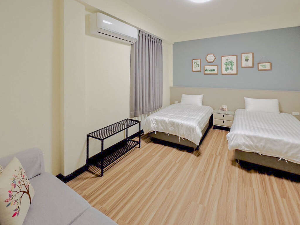 「家庭房」利用层板将宽敞的房内空间做些变化,也让每个床位的旅客在同个空间里稍稍保有隐私感,舒服的色调让人好放松。