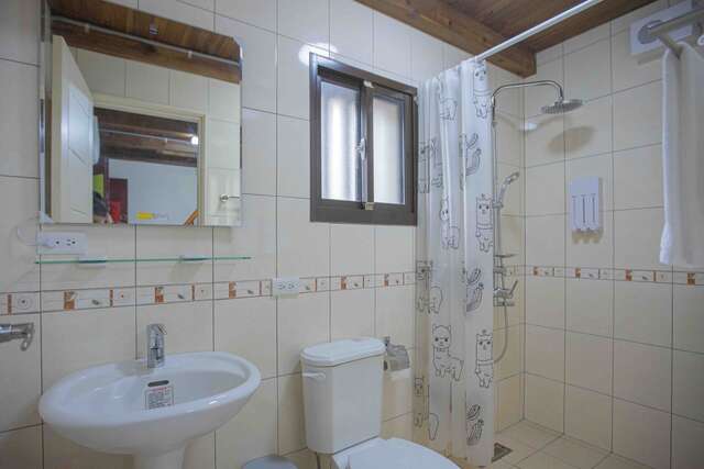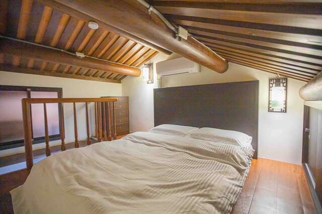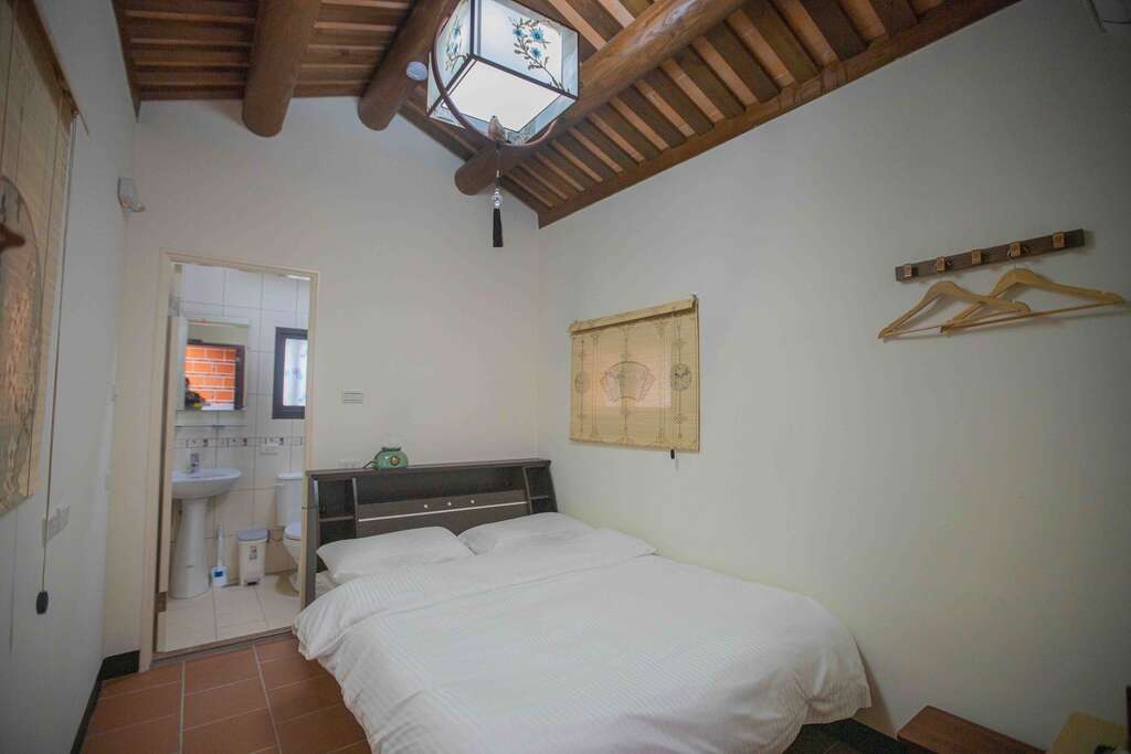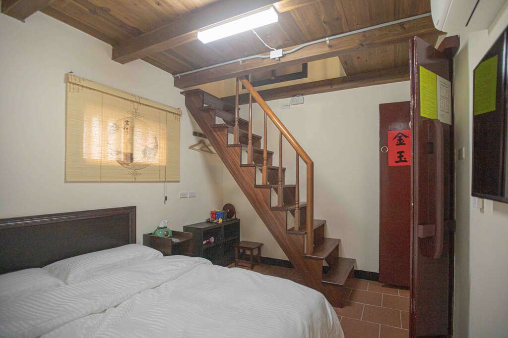 「阁楼家庭房」 二楼空间有别於一般古厝,有两盏漂亮灯饰点亮空间,放下双人床後还有一些空间能走动,是来金门旅游的有趣体验。楼梯特别设计坡度较缓,上下楼梯不再战战兢兢,还有把手可以安全行走。
