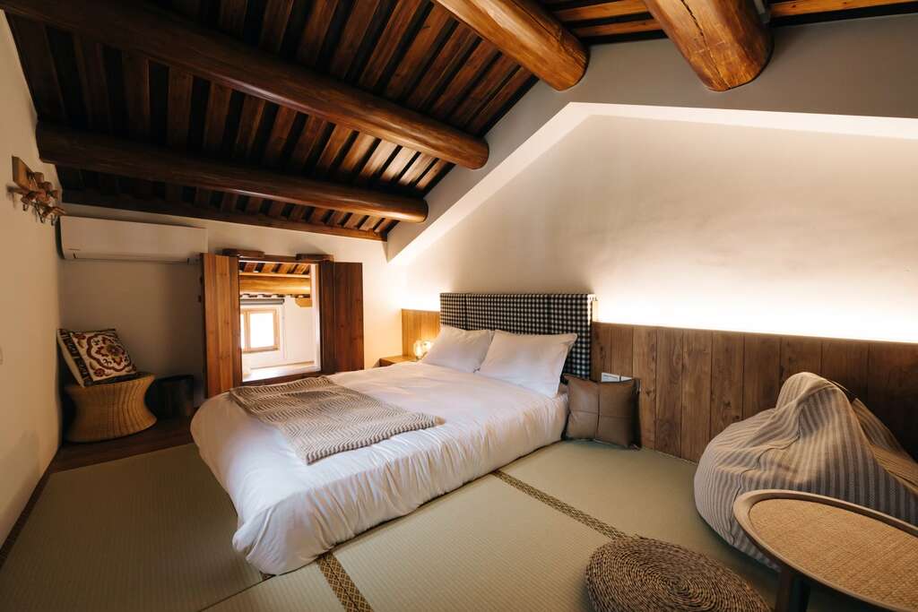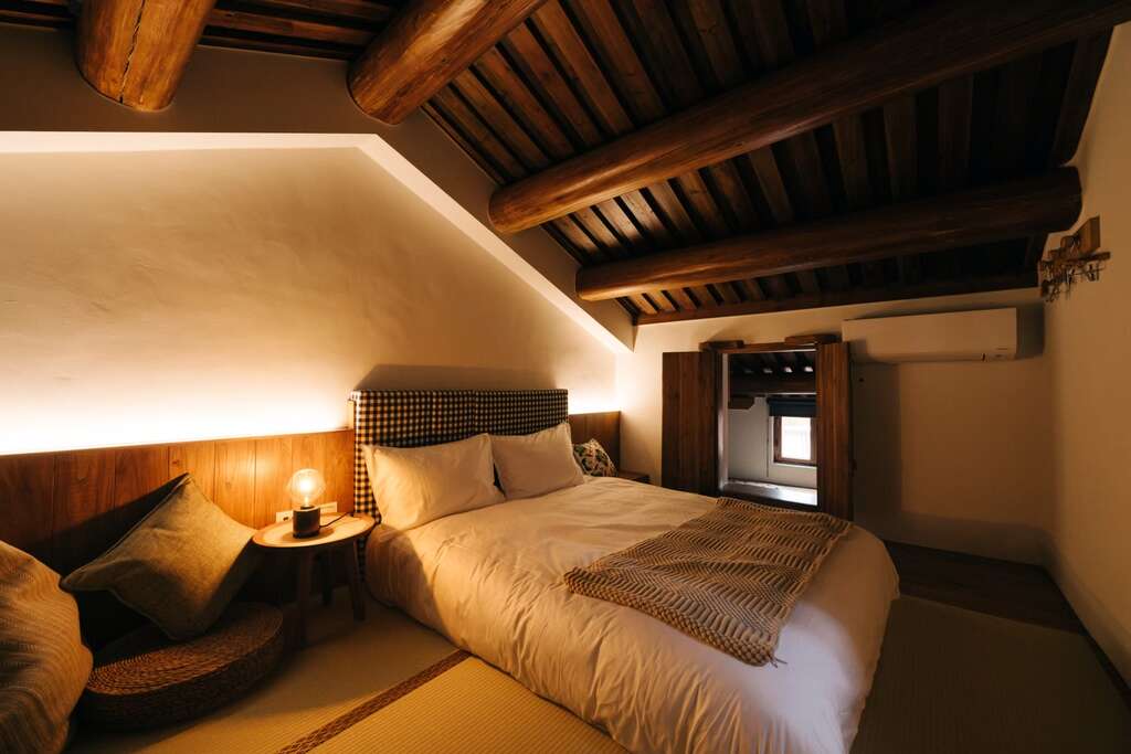 复层的阁楼空间乘载着一家子的回忆,透过旧有老窗,放低姿态,来到榉头上方露台望月摘星,体验这难得的住宿生活。