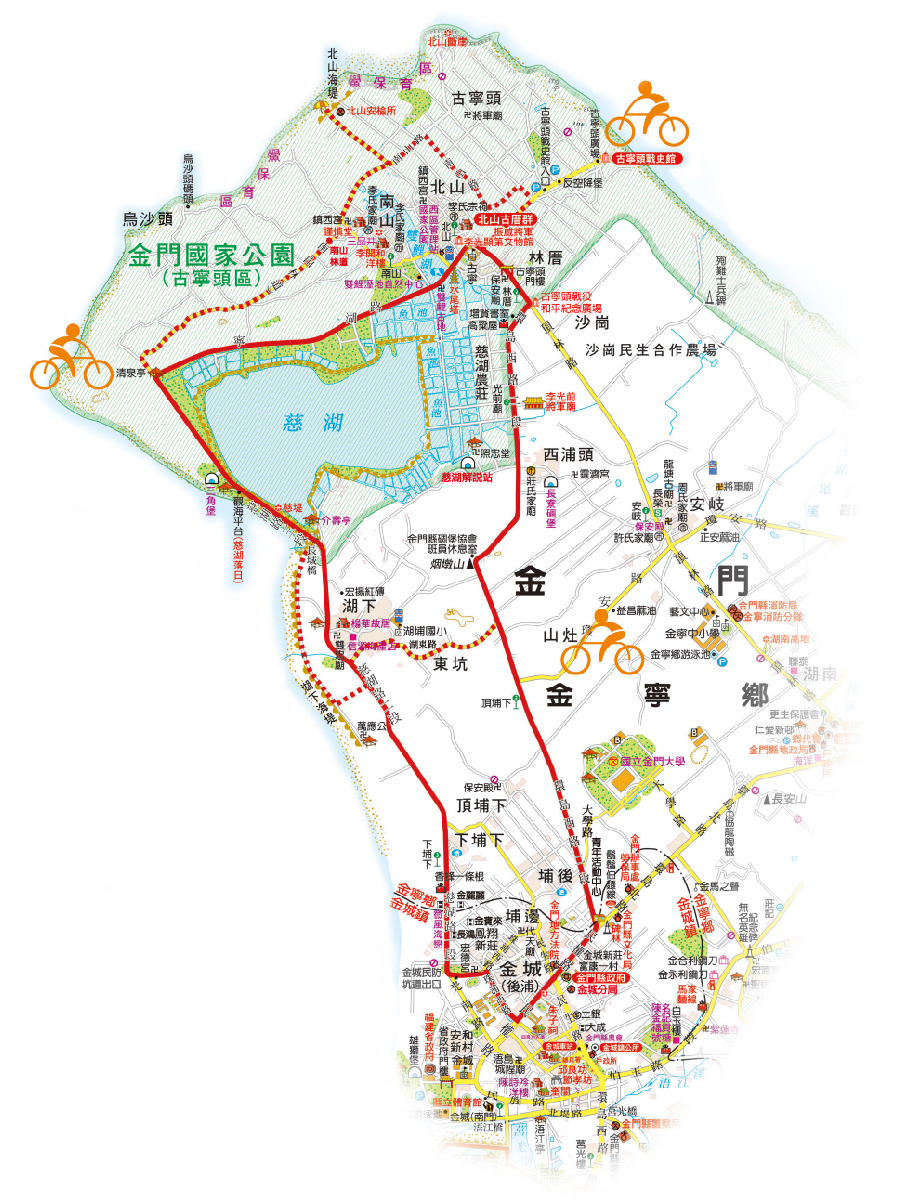 此线位于金门西北部,三面临海,以自然生态与战地史迹为主题,起点为金门青年活动中心,沿途行经西浦头、林厝、北山、湖下等聚落,总长度14.8公里,主要景点有古宁头战史馆、北山海堤、慈湖观景平台、双鲤湿地自然中心以及金城民防坑道等。