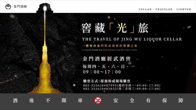 金门酒厂庆祝建厂70周年,首次开放『经武储酒坑道』供旅人购票入内参观,展览活动以「窖藏「光」旅」为策展主轴,规划5种导览体验,包含《开凿仪式》、《高粱微旅》、《酒师匠心》、《窖藏传承》、《KK Bar》等活动,搭配现场环境与金门高粱酒酿造工艺解说,打造全亚洲唯一的高粱酒沉浸体验。《开凿仪式》搭上时光机,带上工程帽,一起回到开凿经武坑道的年代
