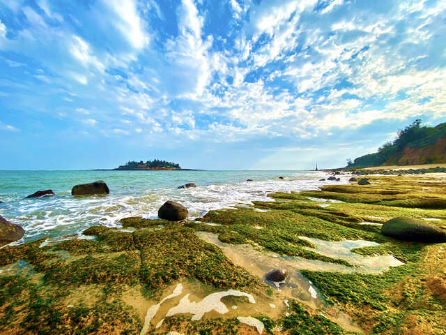 每年3、4月份因湿润温暖的气候,使绿色藻类得以滋长,并布满烈屿南山头海岸石槽,形成连绵不尽的绿色地毯,且只有潮汐最低前後,石槽才会露出,为行销烈屿乡特有的季节性生态景观「绿石槽」,特规画此游程。