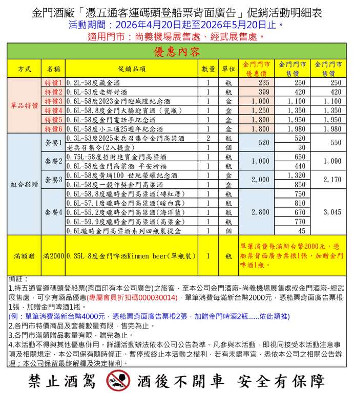 持五通客运码头登船票(背面印有本公司广告)之旅客,於4月20日起至5月20日至本公司尚义机场展售处或经武展售处,可享有酒品优惠,单笔消费每满新台币2000元,凭船票背面广告票根1张,加赠金门啤酒1瓶。(例:单笔消费满新台币4000元,凭船票背面广告票根2张,加赠金门啤酒2瓶……依此类推)