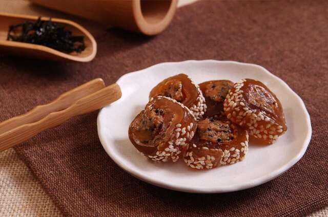 |猪脚贡糖 外表裹上一层芝麻的猪脚贡糖,是圣祖食品的招牌,外皮以麦芽加上面粉所制成,略带Q弹的外皮佐以酥酥的内馅,呈现两种层次的口感,深受饕客喜爱。