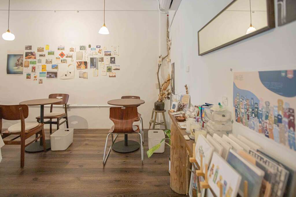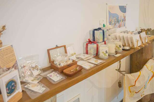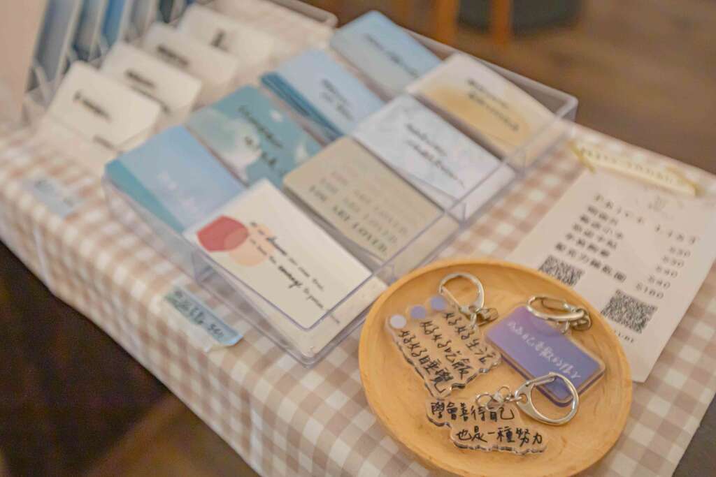 店内有不少「在地文创商品」寄卖中,凡举饰品、香氛、插画明信片、标语旗帜等琳琅满目,展示於中岛区以及後方的墙面区。