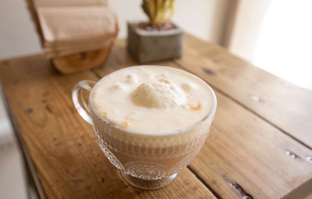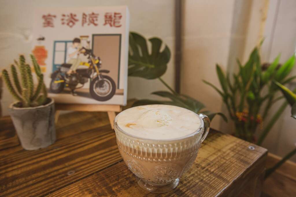 「金门雾」就像是起大雾的金门,白白雾雾的灶煮茶搭配鲜奶、冰淇淋,浓郁口感中挟带着阵阵灶煮茶香。