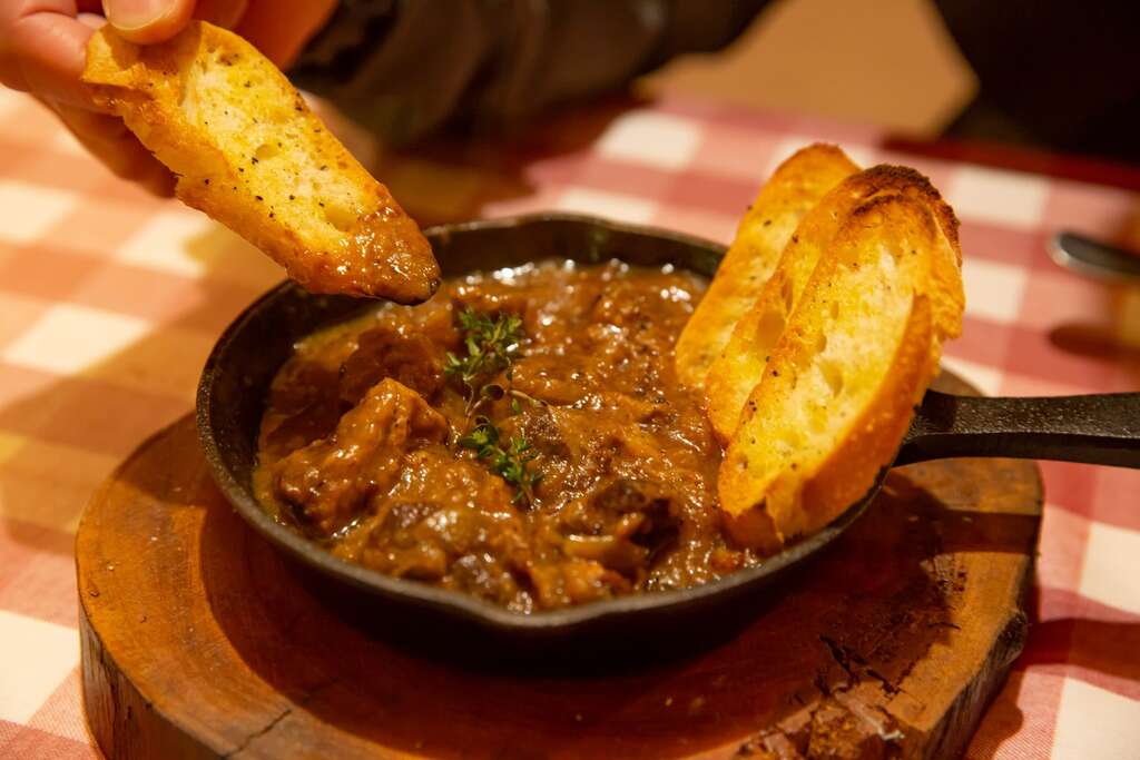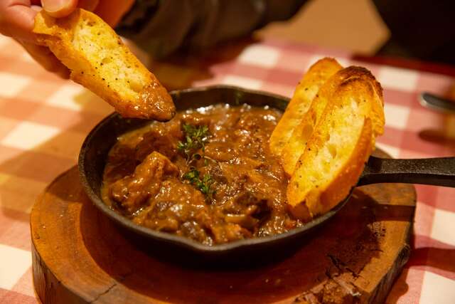 「比利时啤酒炖牛肉」美国牛肋加入啤酒、洋葱,以及增添风味的烟燻培根,慢火炖煮多时,牛肉相当入味。