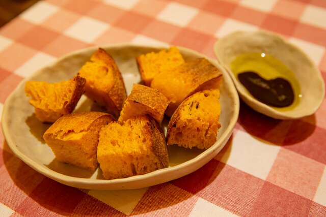 「番茄罗勒面包」每日的面包皆不同,这款番茄罗勒面包吃起来不同於坚韧口感的法国面包,一口咬下可以品尝到淡淡的罗勒香气,口感Q弹松软,另外还有附上橄榄油醋可以搭配沾取。