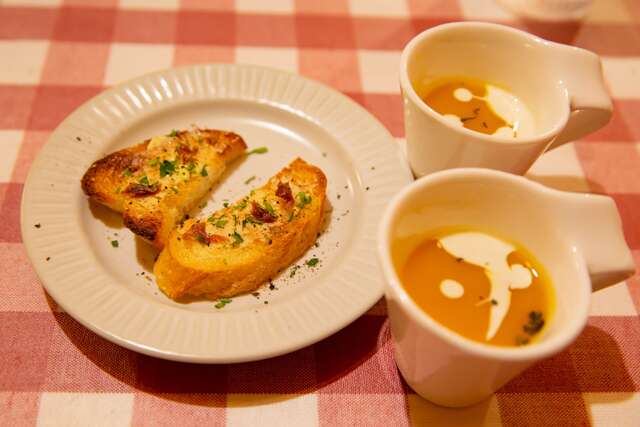 「南瓜浓汤及小面包」南瓜浓汤浓郁且细致,充满南瓜香气,上头加上些许鲜奶油点缀,再搭配烘烤後充满嚼劲的鯷鱼风味法国面包切片,沾上南瓜浓汤享用简直绝配!