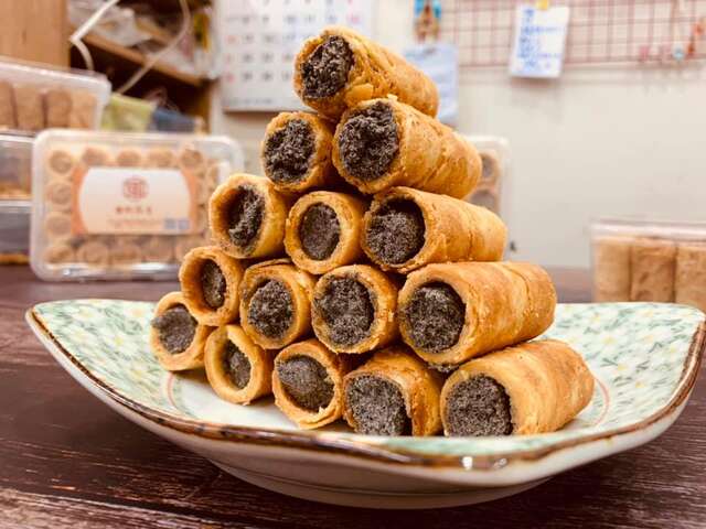 「金门黑芝麻满心蛋卷」 这款手工蛋卷外酥内软,包裹特制黑芝麻内馅,浓郁芝麻香与酥脆蛋卷完美融合。不添加任何凝固剂或黏合剂,舌尖上感受到的香气,完全天然,源自黑芝麻最纯粹的清香。