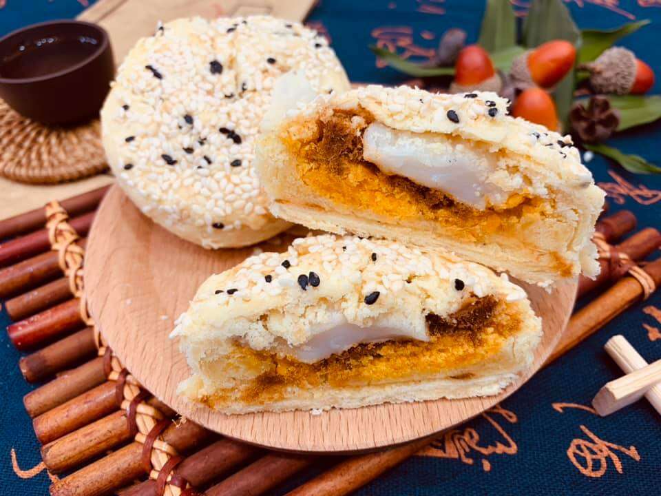 「招牌金门松饼」 店内回购率第一的必吃品项,酥香的外皮包裹着绿豆沙、麻糬、肉松和咸蛋黄四种美味内馅,香酥外衣和软Q内馅完美搭配,让人一试成主顾。