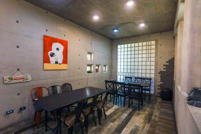 此区域延续清水模的设计,配合大桌子适合多数人在这边聚会聊天。