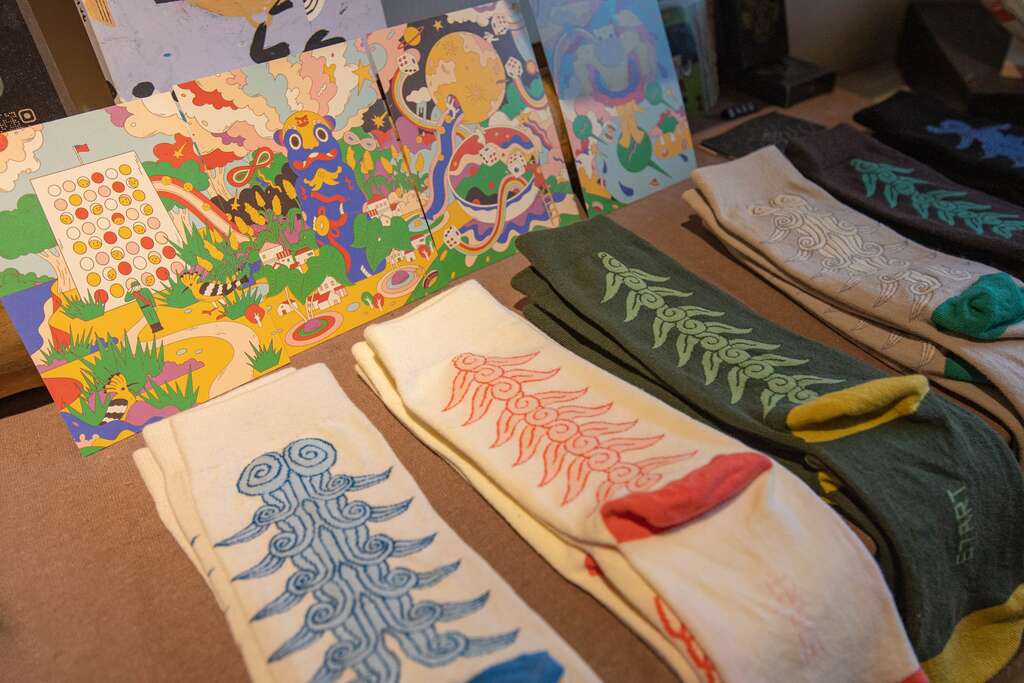 「风狮爷鬃毛袜」 将风狮爷背部的鬃毛,重新绘制设计成图案,结合风狮爷身上的铜钱与葫芦,多款颜色可选购。