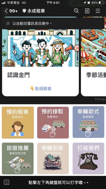我们的业务不仅限於租车,还包括与民宿深度合作等多元化服务,致力於为客户创造更多的价值。我们相信,通过持续的努力和创新,能够为金门的旅游和交通出行带来新的活力。