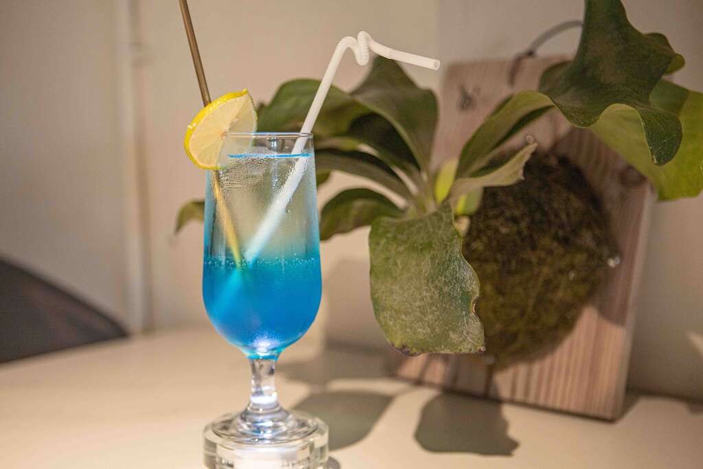 「蓝眼泪特色气泡水」 不只好喝又好看,透明搭配杯底蓝色的色泽及柠檬都让人感觉非常夏天,非常清爽,且杯底下的杯架还会发光,好像在夏天就该喝上这一杯解渴,非常适合拍照打卡。