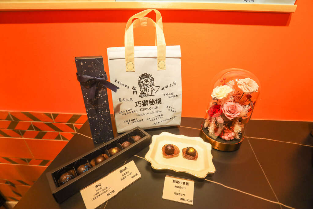 店内的招牌「酒心巧克力-原酿21高粱」令人垂涎,金色外层包覆着原酿21金门高粱酒的香醇,入口即化的巧克力带来微醺的惊喜,完美呈现金门的酒文化。店内提供精致巧克力礼盒,适合作为伴手礼或节庆赠品,让巧克力在艺术感的包装中传递心意。
