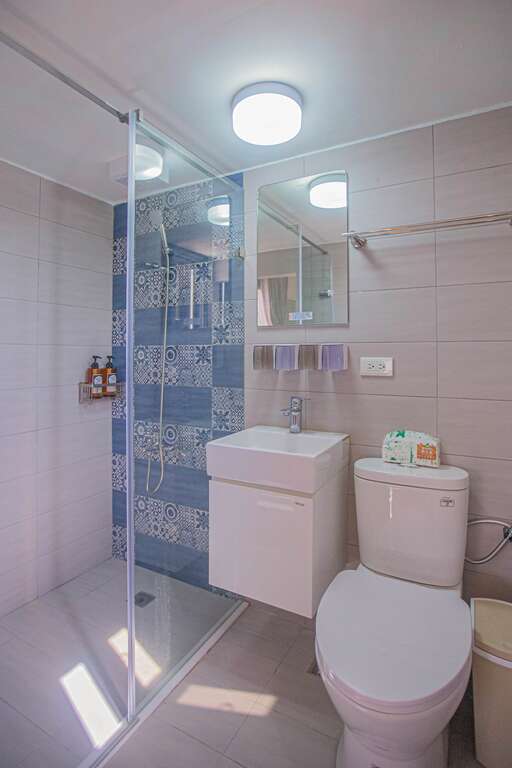 房內備品齊全,盥洗用品經老闆精心挑選,小細節也不馬虎。淋浴間乾淨整潔、採光充足,在牆面上採用特色花磚點綴。