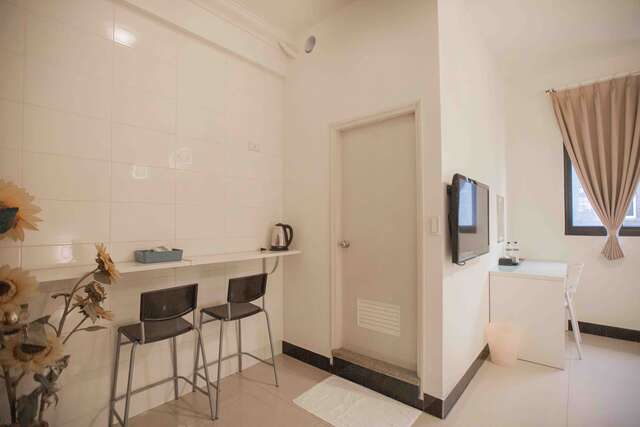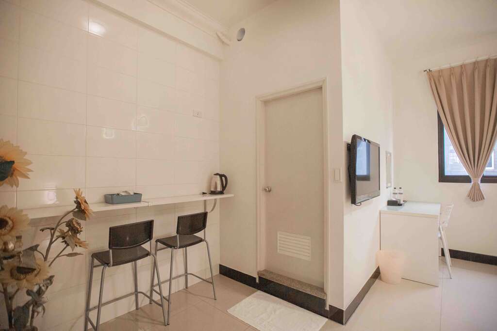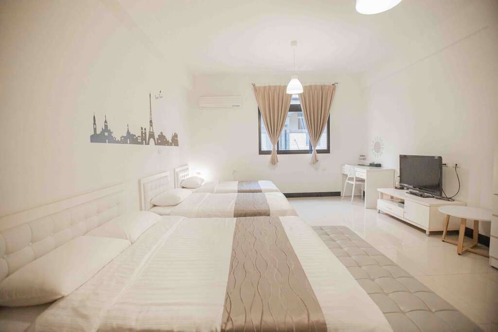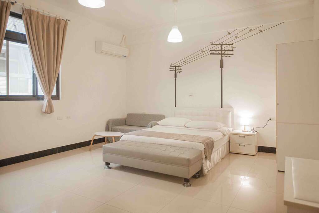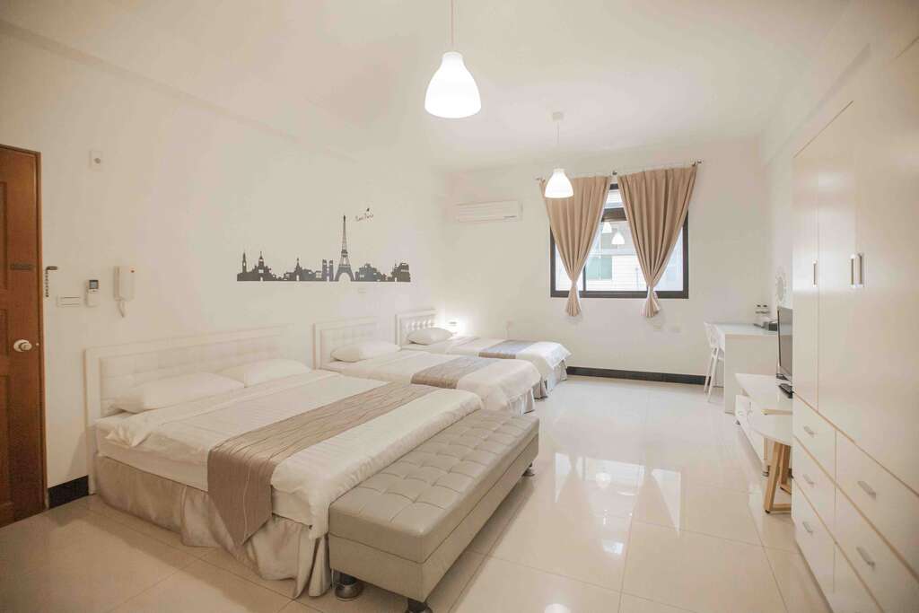 「家庭房」 全白夢幻家具與純淨的白色系寢具相得益彰,營造出一種極致的寧靜氛圍。每一個細節都體現了民宿主人對生活品質的追求,讓人彷彿置身於一幅寧靜而優雅的畫中。