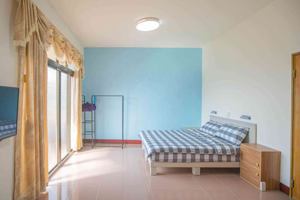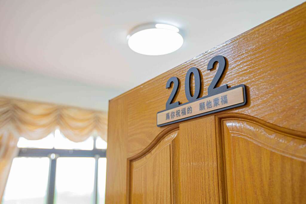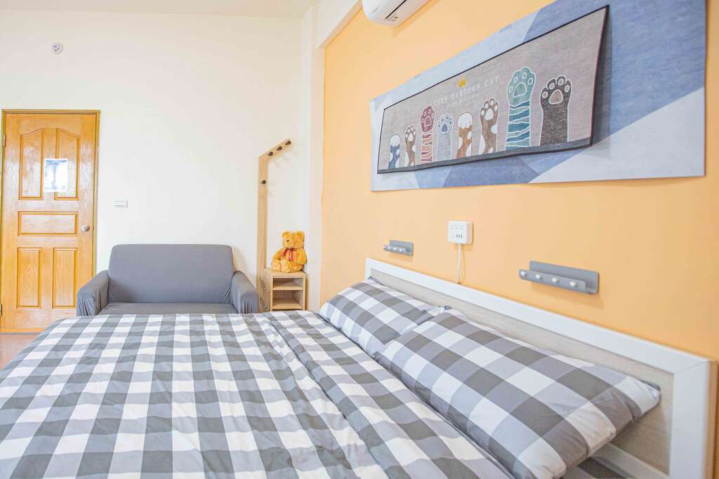 淺色系的牆面讓原本就寬敞無比的房內看起來更大間,仔細一看可發現床組是「花帔」紋路,是老闆專程訂製!