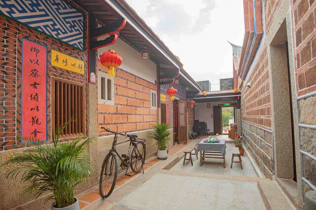 古厝保存完整,在主建築兩側的空間「護龍」分別有兩間客房,走廊空間打理得相當舒適,不只有復古腳踏車,還可稍作歇息喝口茶~