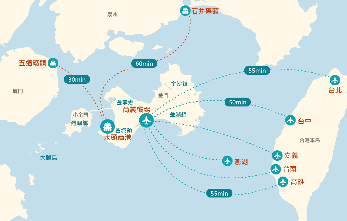 金門由金城鎮、金寧鄉、金沙鎮、金湖鎮與需要坐船才能抵達的小金門組成,機場位於金門中部,水頭碼頭所在的金城鎮,是金門最繁鬧的地區,建議至少停留三天兩夜。