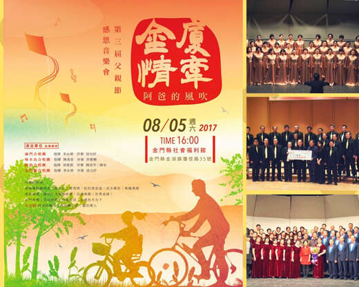 「2017金門縣父親節感恩音樂會~金廈情牽,阿爸的風吹」,將於8月5日下午4時起假社福館演藝廳舉行,由金門縣合唱團、圓韵合唱團、啄木鳥合唱團等兩岸三地合唱團聯袂演出,將用歌聲獻唱「阿爸的風吹」、「金門春曉」「后浦晚霞」等歌頌父愛以及金門的歌曲,藉以感恩偉大的父愛精神並發揚孝道,歡迎民眾踴躍前往聆聽。