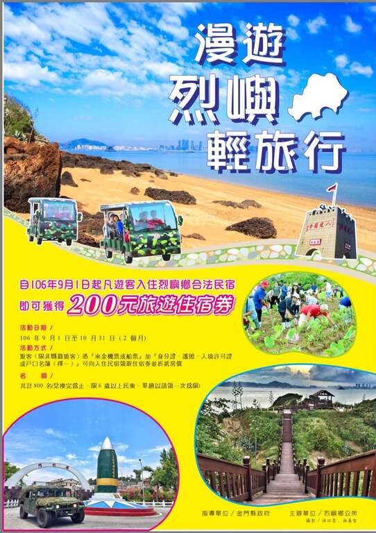 鄉長洪成發表示,為鼓勵遊客蒞鄉觀光,今年度賡續發行旅遊住宿券獎助,結合芋頭季系列活動,印製發行面額200元之旅遊住宿券800張,自106年9月1日起,凡入境遊客(以外地遊客為主)於烈嶼本地入住合法民宿達1天以上者,即可每人獲取200元旅遊住宿券乙張(限6歲以上,單趟以請領一次為限)。
