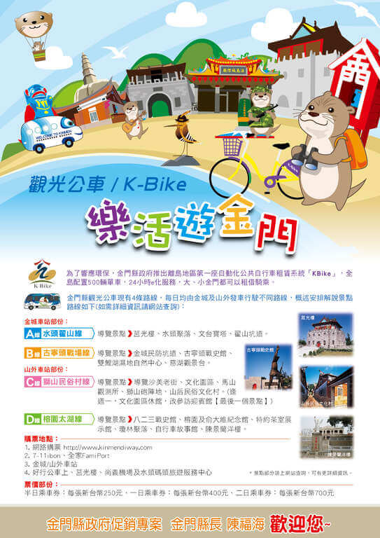 另推出戰地遊程-「毋忘在金 重返榮耀」及「生存遊戲 金門開戰」體驗賽,活動邀請曾經在金門服役的「金好漢」重回金門,活動期間蒞金旅遊達3天2夜者,提供「金好漢旅遊獎助金新臺幣1千元」;此外並贈送其同行親友「毋忘在金」紀念T恤。還配合本次活動提供生存遊戲愛好者實地體驗,11月17日至19日更將舉辦「雅典娜行動」國際賽事,廣邀各地生存遊戲的高手,一起齊聚金門參與這場國際賽事,洽詢電話為:082-316460。