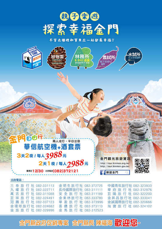 「2017台北國際旅展」將於10月27日至30日在台北世貿一館舉辦。本次旅展主打親子生態旅遊-「親子樂遊 探索幸福金門」、「古道登山遊程」等主題活動。活動提供登山旅客達人導覽(自費)、導覽器租借、登山杖借用、休憩與補給等功能。及規劃「金門親子DIY聯合套券」,包含農試所農村趣味DIY、水試所豆豆拼鱟DIY、植物園彩繪蛋蛋鳥DIY、風獅爺筆筒DIY、植物園葉拓環保袋DIY等選擇,感受金門四所一園親子樂遊的互動體驗,洽詢電話為:082-372032。