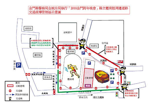 金城分局指出,2018金門跨年晚會活動將實施交通管制措施如下(如圖):