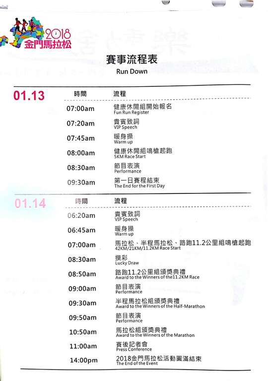 聞名中外的「2018第十一屆金門馬拉松」將於1月13、14二日於國立金門大學舉行,金門縣政府為推廣全民運動也兼顧金門離島的觀光效益,今年更豐富活動內容,讓一天的馬拉松比賽延伸成二天的嘉年華會,要讓選手們在激烈競技的賽事後,有充裕的時間欣賞金門戰地美景和自然生態,品嚐在地美食及膾炙人口的金門高粱酒。