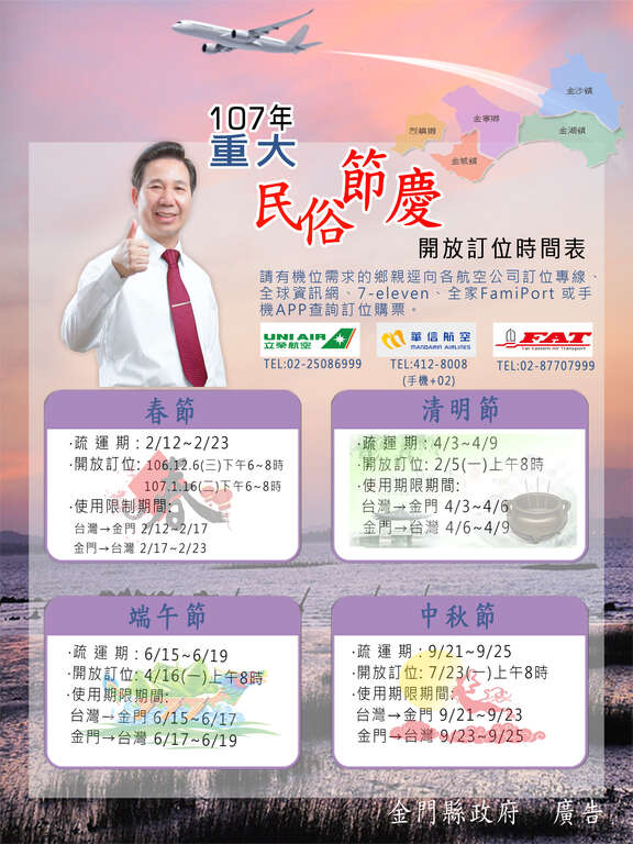 縣府指出,107年春節管制期間台金航線正班機及第一波加班機已於106年12月6日下午6時開放訂位,第二波加班機將於107年1月16日下午6時統一開放訂位,1月19日(五)前要完成開票,觀光處已協調本縣5鄉鎮公所同步開設服務臺協助鄉親訂位。