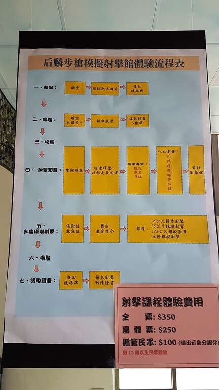 縣府觀光處指出,后麟步槍模擬射擊館,提供遊客一個全新軍事體驗場所。由鄉公所派駐專業人員負責日常操作營運管理工作,依使用者付費觀念,採「使用者付費」方式開放民眾體驗,每張票收費新台幣350元,鄉親100元及團體(12人以上)優惠250元。服務中心內設有拍照區做電腦合成照供遊客選擇,具有紀念意義。