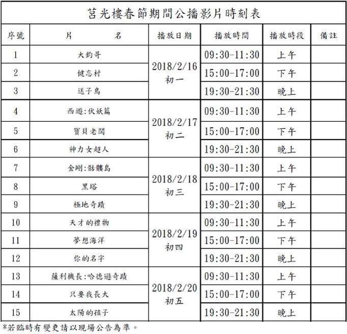 縣政府觀光處表示,農曆春節期間,為了歡迎回家過年的鄉親朋友,以及來金旅遊的觀光遊客,自大年初一到初五,莒光樓除了正常開放參觀之外,更蒐羅了中外知名共15部的強檔電影,取得公播版權安排播放,包含經典賀歲喜劇「大釣哥」、「健忘村」、「西遊:伏妖篇」;老少咸宜的「送子鳥」、「只要我長大」;叫好叫座的「你的名字」、「金剛:骷髏島」、「神力女超人」;溫馨感人的「極地奇蹟」、「太陽的孩子」等等,眾多熱門影片精采可期。