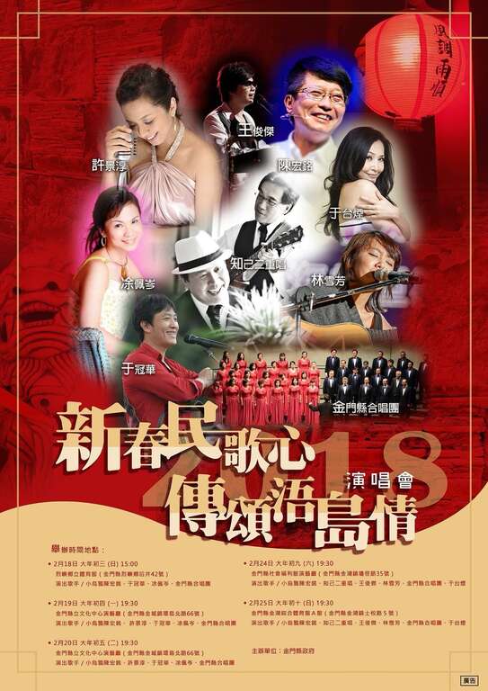 為營造春節歡樂氛圍,增進返金鄉親及到訪遊客能夠有更豐富的多元遊程感受,金門縣政府觀光處特地於2月18日(大年初三)至2月25日,舉辦共五場次「新春民歌心·傳頌浯島情」民歌巡迴演唱會,期望透過這些經典傳唱的民歌旋律,帶領大家一起重溫那單純與美好的年代。