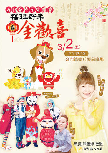由金門縣文化局主辦之「福旺好年‧金歡喜」2018金門元宵燈會,今年特別擴大辦理,除高達八米的主燈設置於總兵署主會場外,十座副燈分布在金城鎮內,包括浯江書院、邱良功古厝、城隍廟、東門代天府、西門外武廟、南門天后宮、北門北鎮廟等,迎鄉親、遊客前往各燈會會場看花燈、猜燈謎,感受節慶喜氣。另外,在水頭碼頭入境大廳與金門機場入境大廳,也設置迎賓主題花燈,讓往返的遊客及返鄉鄉親感受到家鄉年節氣息。