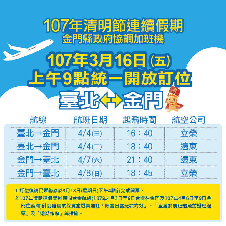 為服務鄉親於清明連續假期返鄉祭祖,縣府特協調航空公司於4/4、4/7及4/8放大機型及加開班機,計往返台北─金門4架次,雙向提供1,116座位數,訂於107年3月16日(星期五)上午9時受理訂位,並請民眾務必於3月18日(星期日)下午4點前完成開票。