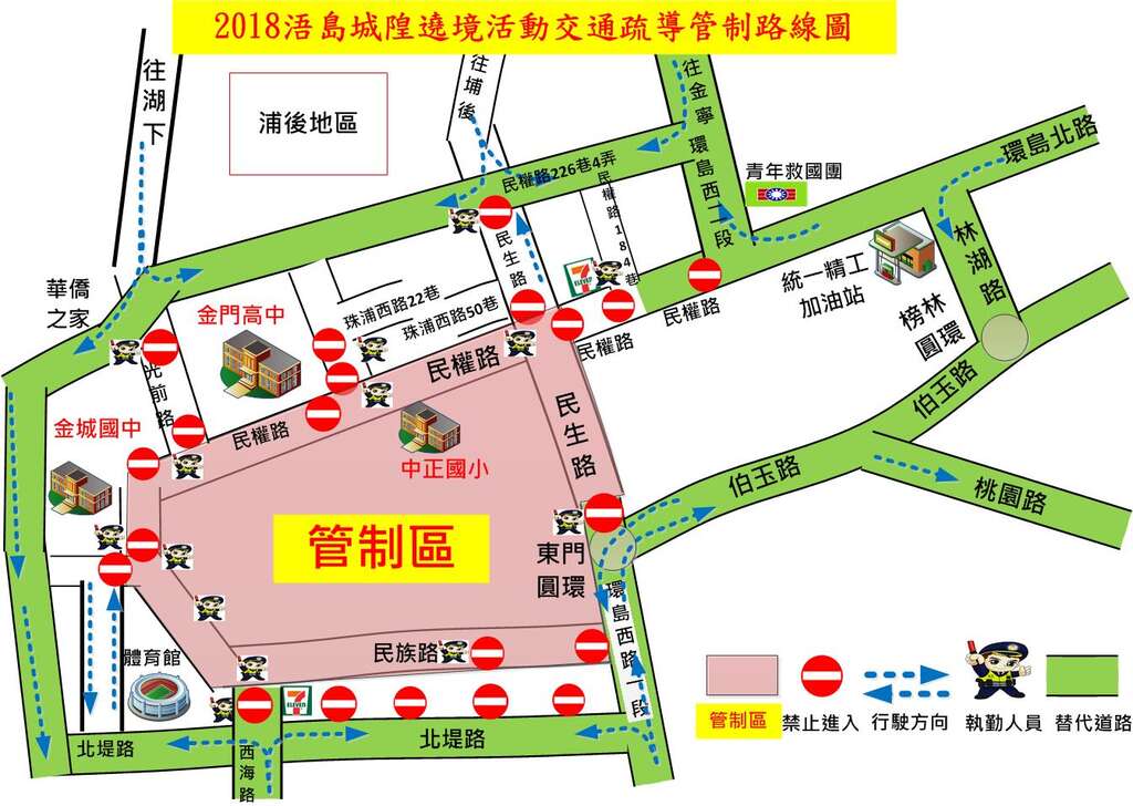 有關管制區範圍為金城鎮市區民族路、民權路、民生路所圍繞之市區道路,禁止車輛進入,未依規定停放車輛加強拖吊,當天車輛行駛前往金城鎮市區各路口行車動線如下:
